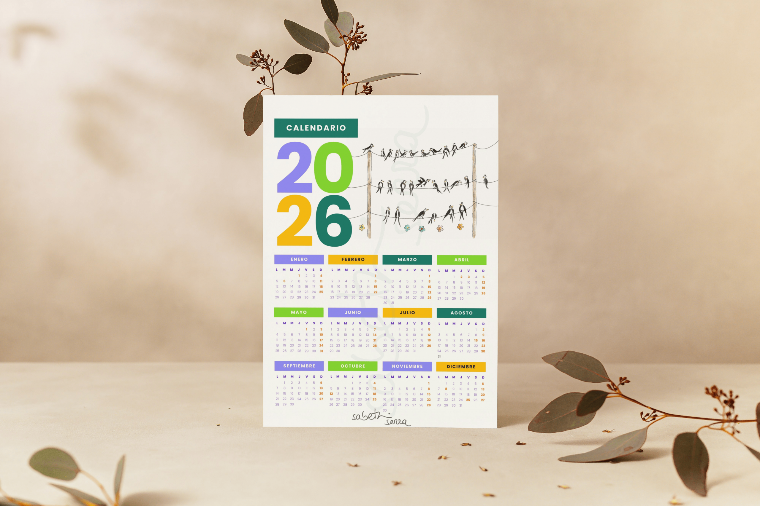 Calendario anual 2026 – Ilustración de golondrinas